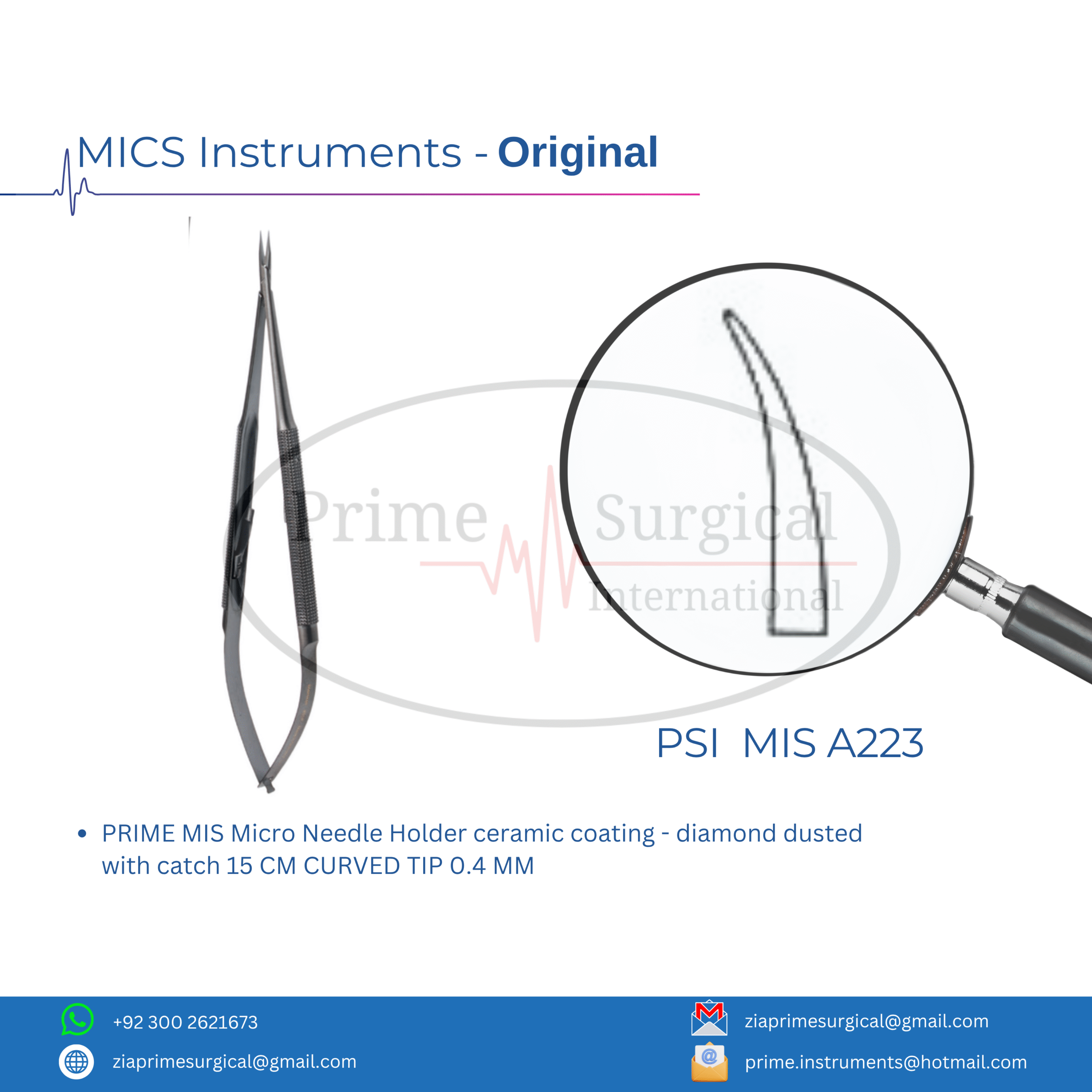 PRIME MIS Micro Needle Holder ceramic coating – diamond dusted with catch 15 CM CURVED TIP 0.4 MM