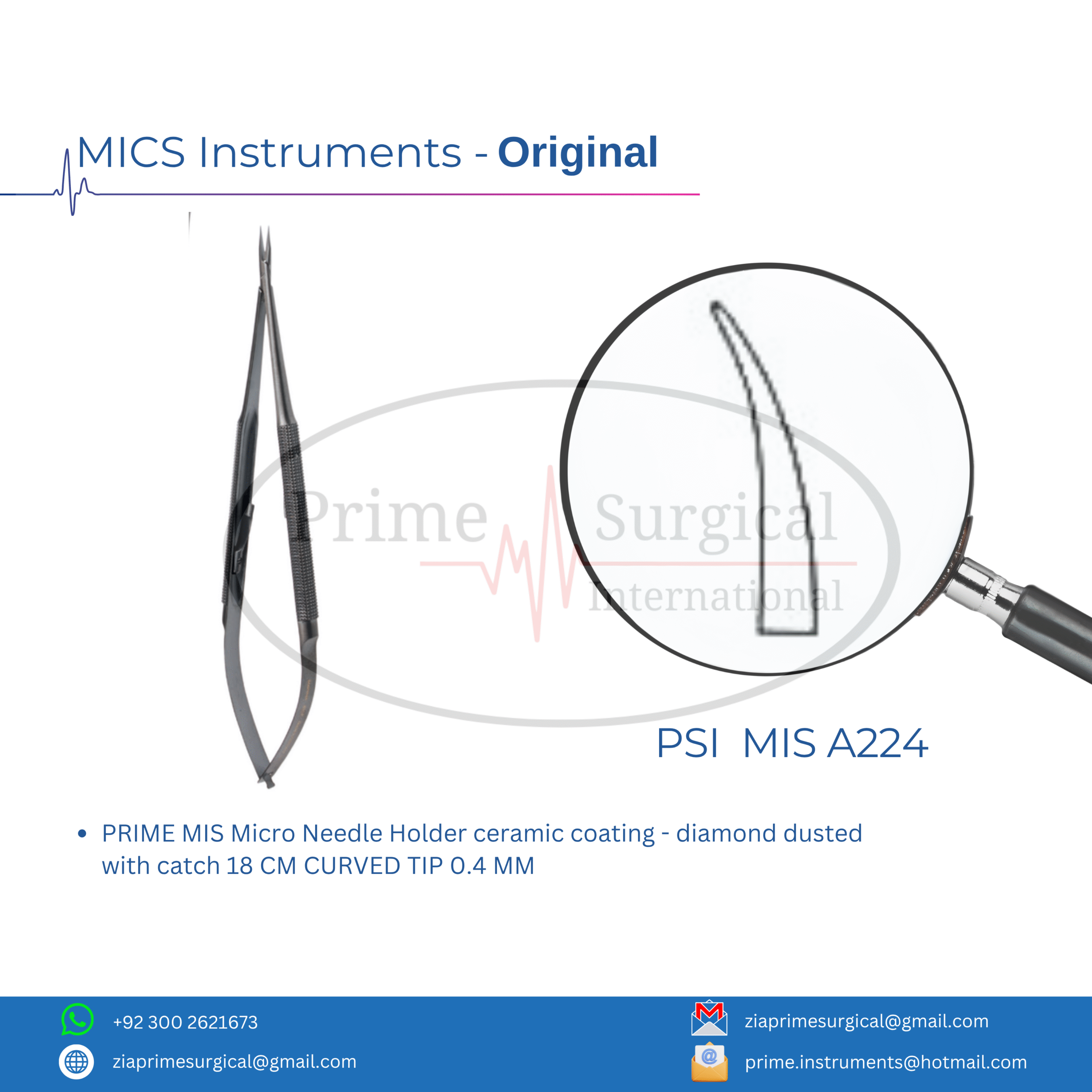 PRIME MIS Micro Needle Holder ceramic coating – diamond dusted with catch 18 CM CURVED TIP 0.4 MM