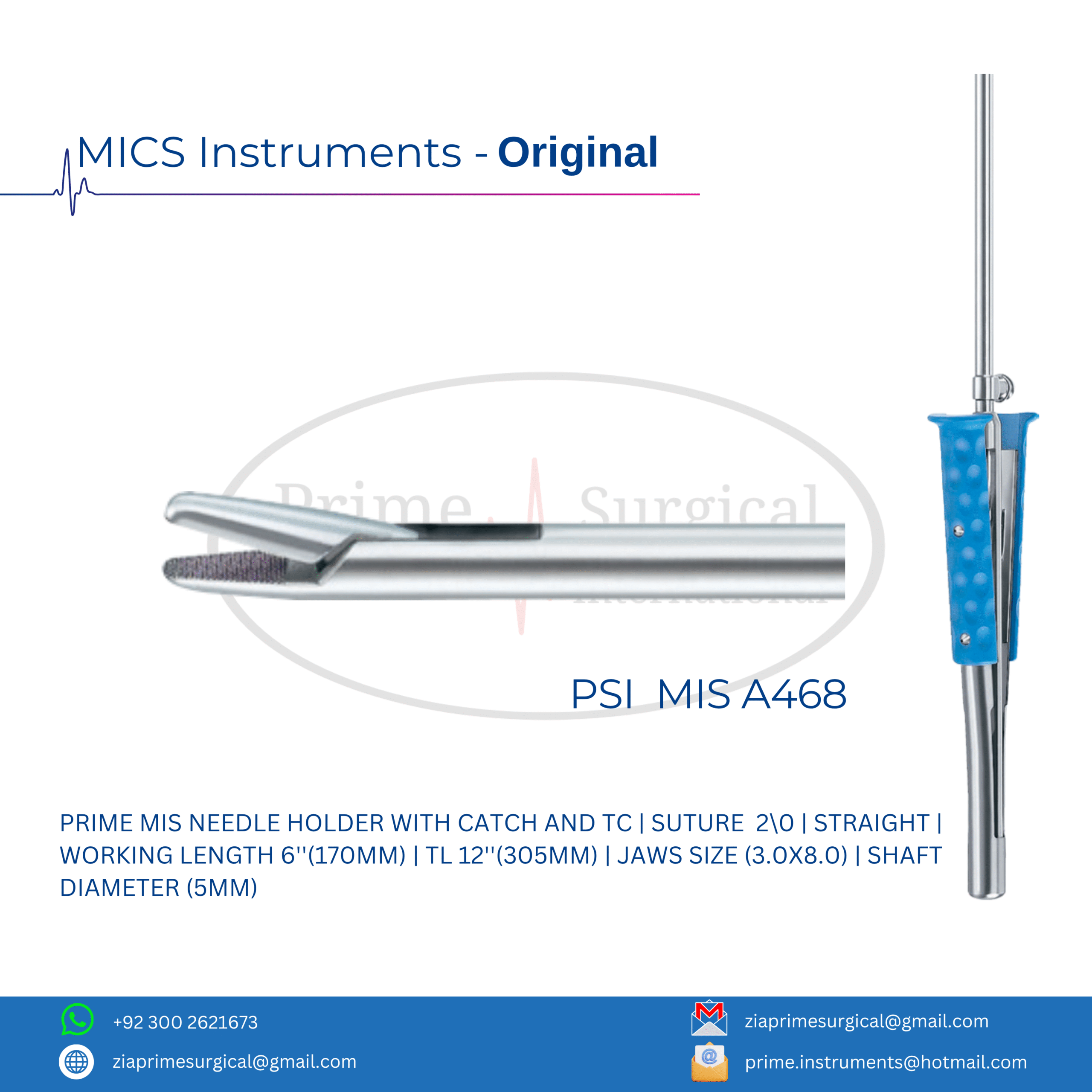PRIME MIS NEEDLE HOLDER WITH CATCH AND TC | SUTURE 2 | STRAIGHT | WORKING LENGTH 6”(170MM) | TL 12”(305MM) | JAWS SIZE (3.0X8.0) | SHAFT DIAMETER (5MM)